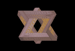 Our eyes are trained to receive "cues" from the environment telling us what we are looking at. In the case of the impossible hex, an illusion generated by the interlacing of two impossible triangles, the lighting, grain of the wood, and the apparent intersections, all seem to clearly show the intersection of two wooden beams at right angles at each vertex. However, our knowlege of spatial relations tells us that no object built with such angles could exist. Any two points on either triangle do not point to paradox, but all three at once? The mind rejects it. And correctly so- no triangles to date have been discovered in Euclidean space with three right angles.